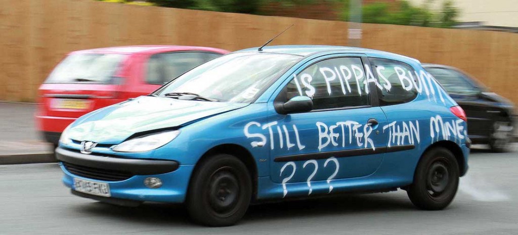 The red-faced driver of the Peugeot 206, was caught on camera driving through Birmingham with ‘Is Pippa’s Bum Still Better Than Mine???’ daubed across the side of it in white paint.