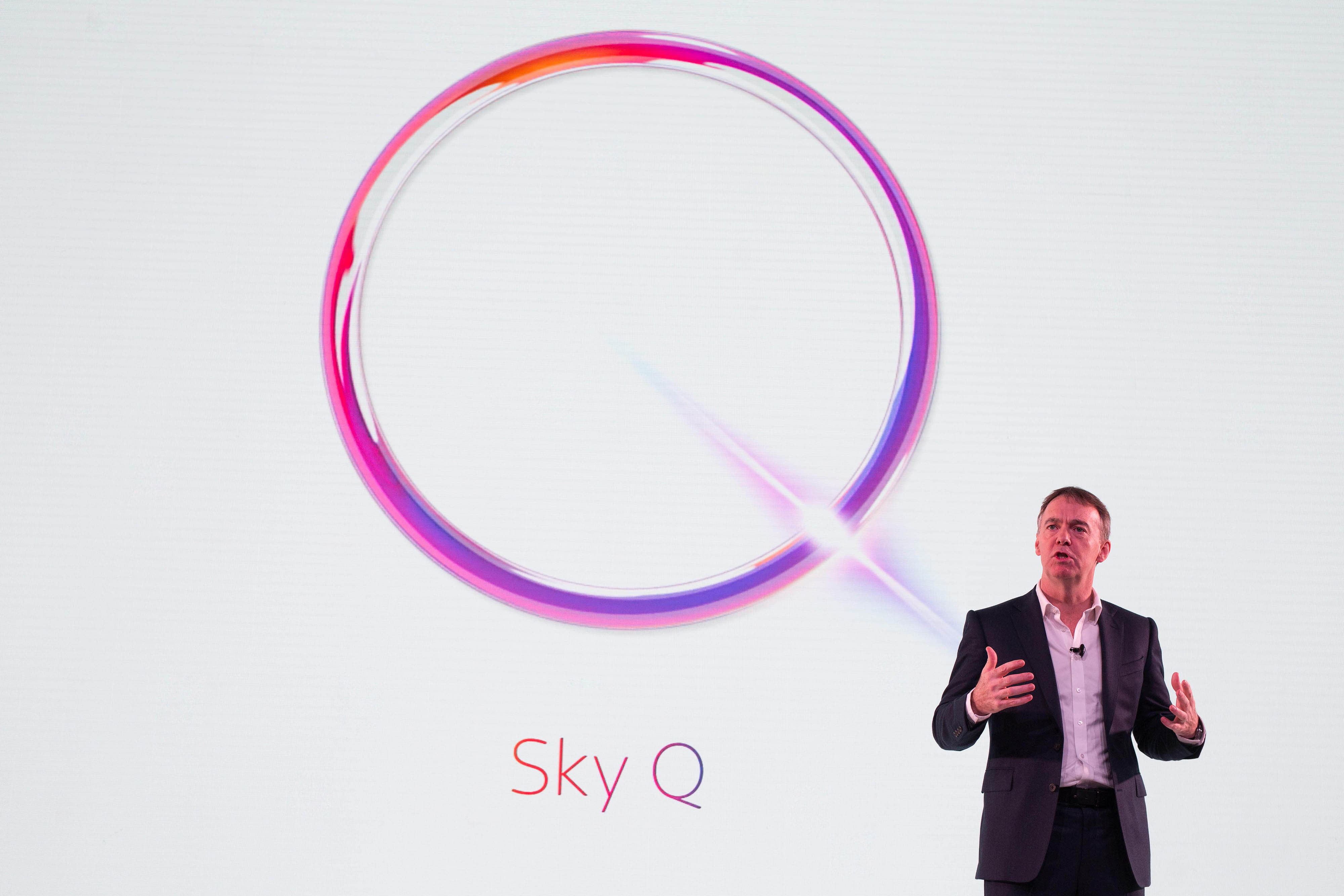 Jeremy Darroch: Chief Executive at Sky, speaking on stage at the launch of Sky Q, which is SkyÕs next generation home entertainment system, Southbank, London.